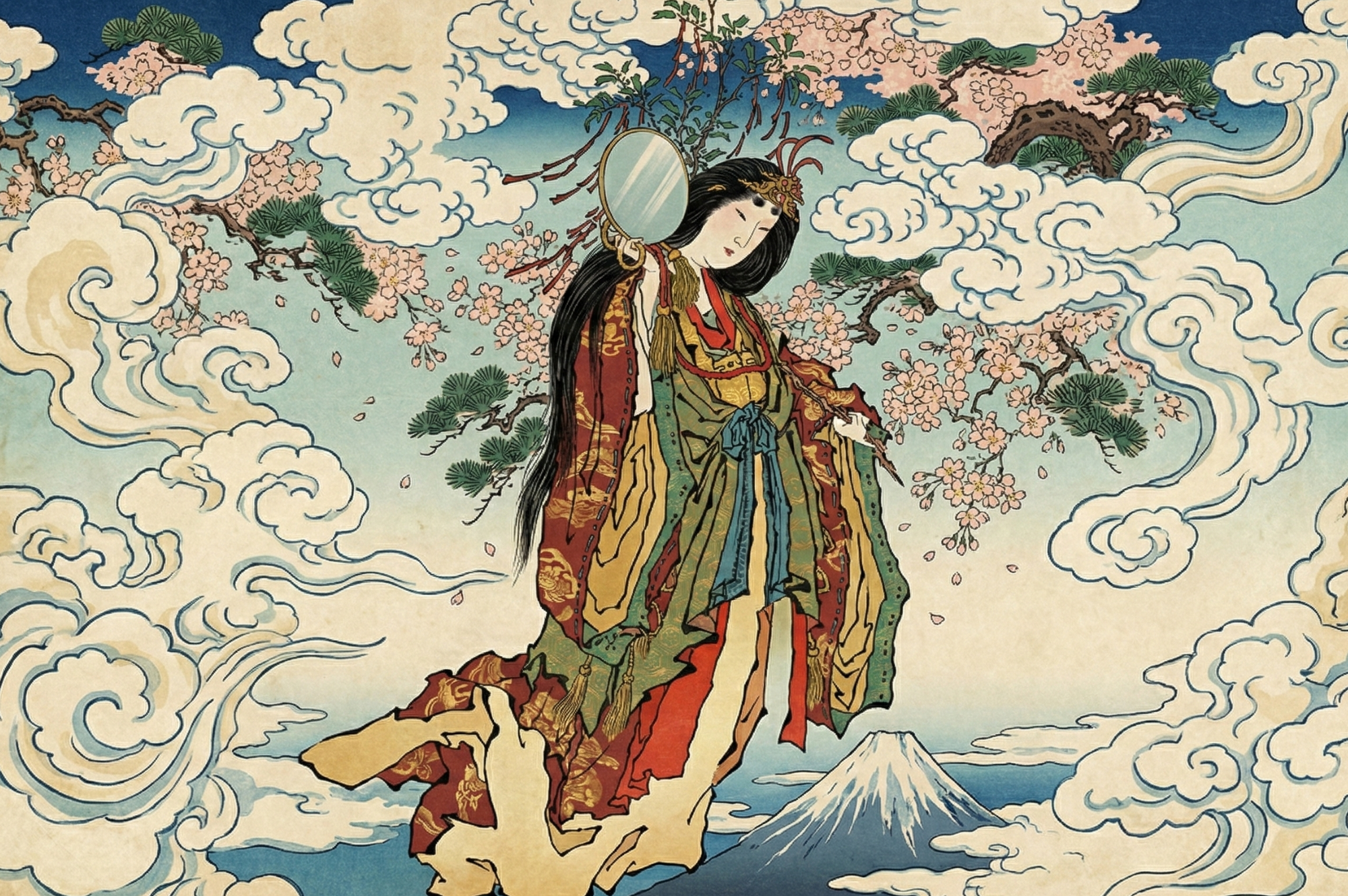 โคโนฮานะซากุยะฮิเมะ เป็นเทพธิดาแห่งดอกซากุระและความอุดมสมบูรณ์ นางตกหลุมรักกับเทพแห่งภูเขา นินิงิ โนะ มิโกโตะ แต่เขากลับสงสัยว่านางอาจไม่ได้ตั้งครรภ์กับเขา ทำให้เพื่อพิสูจน์ความบริสุทธิ์ โคโนฮานะซากุยะฮิเมะจึงเข้าไปในกระท่อมที่ถูกไฟเผาและให้กำเนิดบุตรท่ามกลางเปลวเพลิง โดยไม่เป็นอันตรายแม้แต่น้อย นั่นพิสูจน์ว่านางซื่อสัตย์ต่อสามีของตน