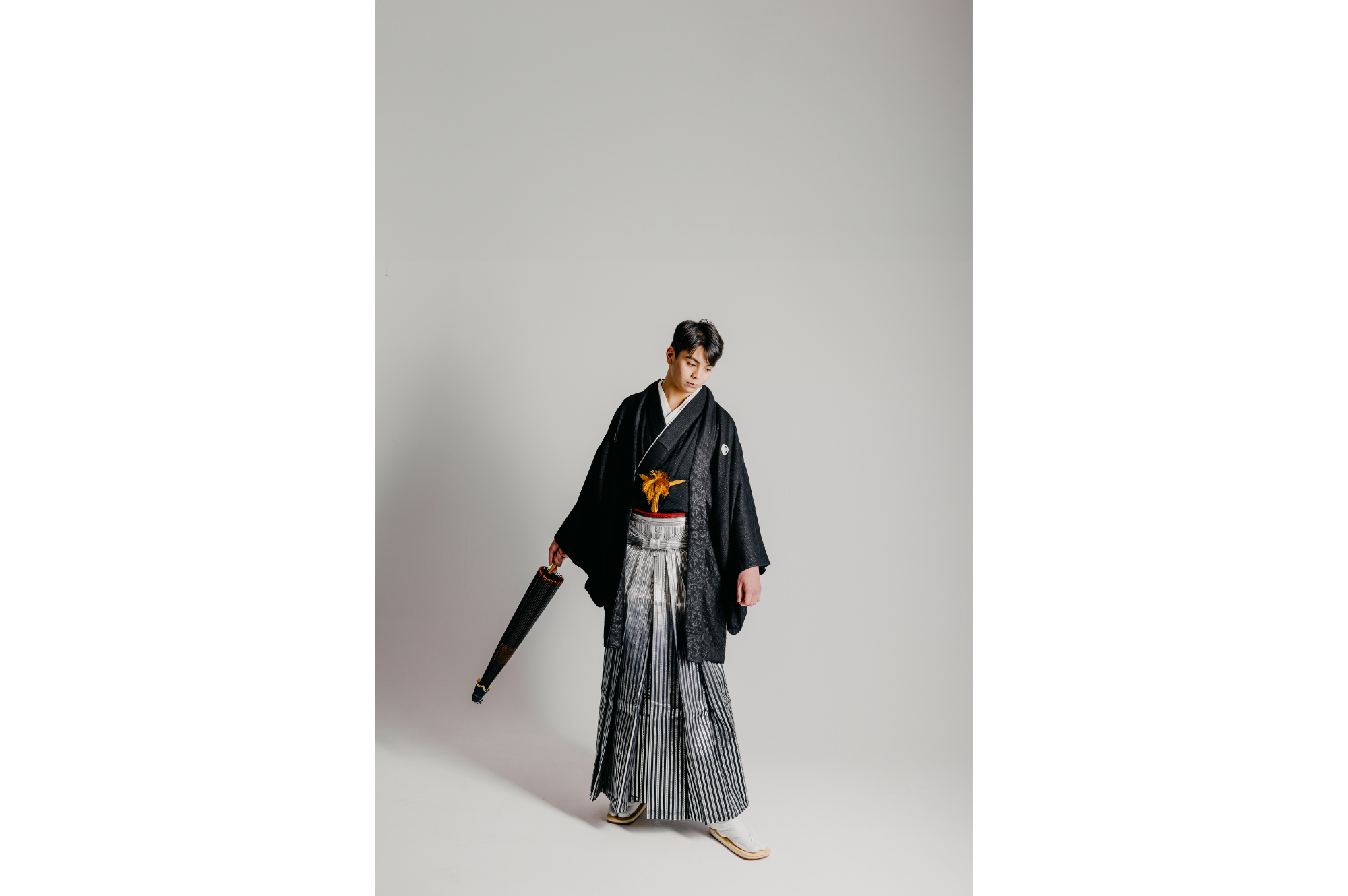 กิโมโนผู้ชายมีดีไซน์เรียบ สีเข้ม เช่น ดำ เทา น้ำเงิน หรือเขียวเข้ม เน้นความสุภาพและความสง่างาม มากกว่าความโดดเด่นทางลวดลาย