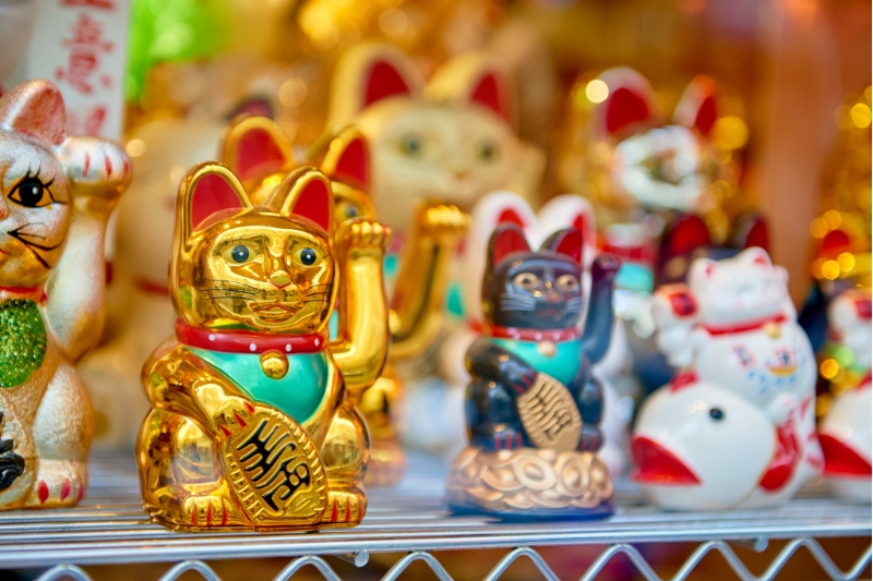 นอกจากสุภาษิตแล้ว แมวยังปรากฏในวัฒนธรรมญี่ปุ่นอีกมากมาย เช่น ตุ๊กตาแมวกวัก (招き猫 / Maneki Neko) ที่เชื่อว่าจะนำโชคลาภและลู กค้ามาให้ร้านค้า จึงมักเห็นตั้งอยู่หน้าร้านอาหารหรือร้านค้าในญี่ปุ่น