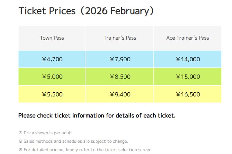Ace Trainer's Pass: สามารถเข้าโซน Pokémon Forest และ Sedge Town ได้ในเวลาที่ต้องการอย่างอิสระ นอกจากนี้ยังมาพร้อมสิทธิพิเศษอื่นๆ เช่น กิจกรรมMeet & Greet, สำรองที่นั่งสำหรับการแสดง Sedge Gym Show, สิทธิ์ใช้ช่องทางด่วนสำหรับเครื่องเล่นต่างๆ และของที่ระลึกสุดเอ็กซ์คลูซีฟอีกด้วย